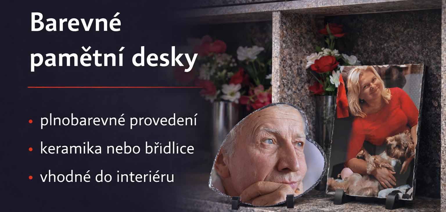 Představujeme barevné vzpomínkové desky na Vaše milované. Uctít památku na Vaše nejbližší a přátele můžete nejen na hřbitově, ale i columbáriu (stěna s urnami) nebo v soukromý domova s našimi barevnými náhrobními deskami.