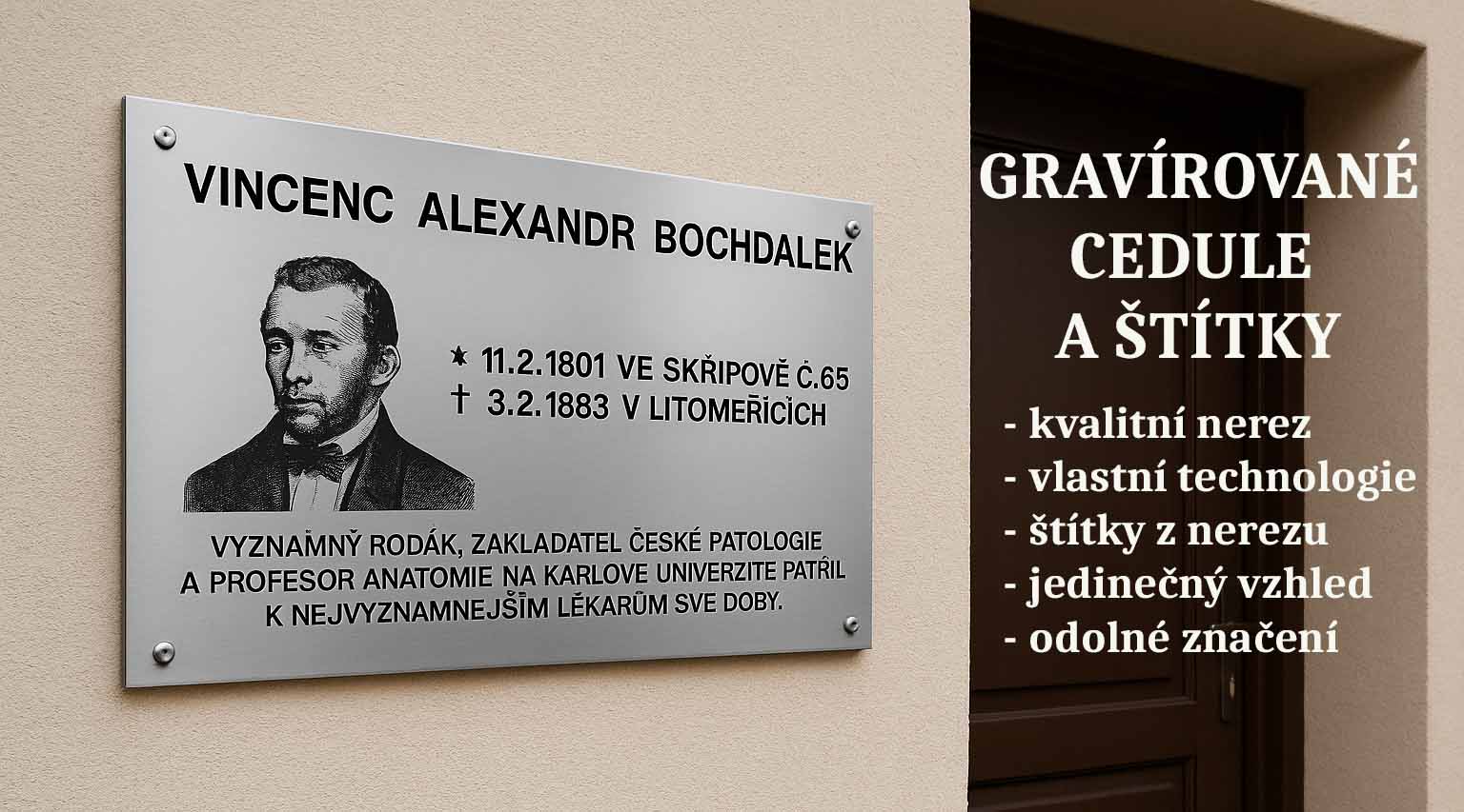 Výroba štítků a cedulí pomocí metody gravírování a žíhání laserem. Pamětní desky, cedulky na dveře, reklamní cedule, čísla popisná vyrábíme z kvalitního nerez plechu o tl. 1mm pomocí speciální technologie. Takto vyrobená pamětní deska má velmi kvalitní značení odolné vůči počasí. Nerez je vhodný na venkovní i vnitřní použití. O kvalitě a odolnosti se můžete přesvědčit v našich testovacích videích, které najdete ZDE a ZDE.