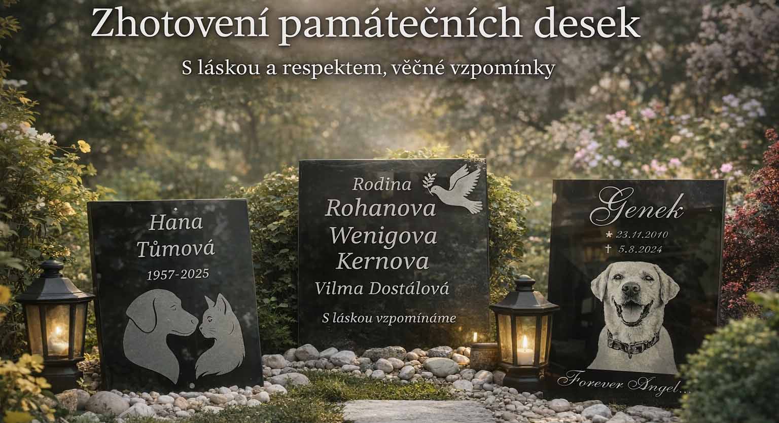 Sklo je vhodné jak pro lidské tak i zvířecí náhrobky. Nabízíme několik ornamentů a vzorů písma, kterými dokážeme přizpůsobit desku na míru. Na přání rádi vyvrtáme i otvory pro uchycení.