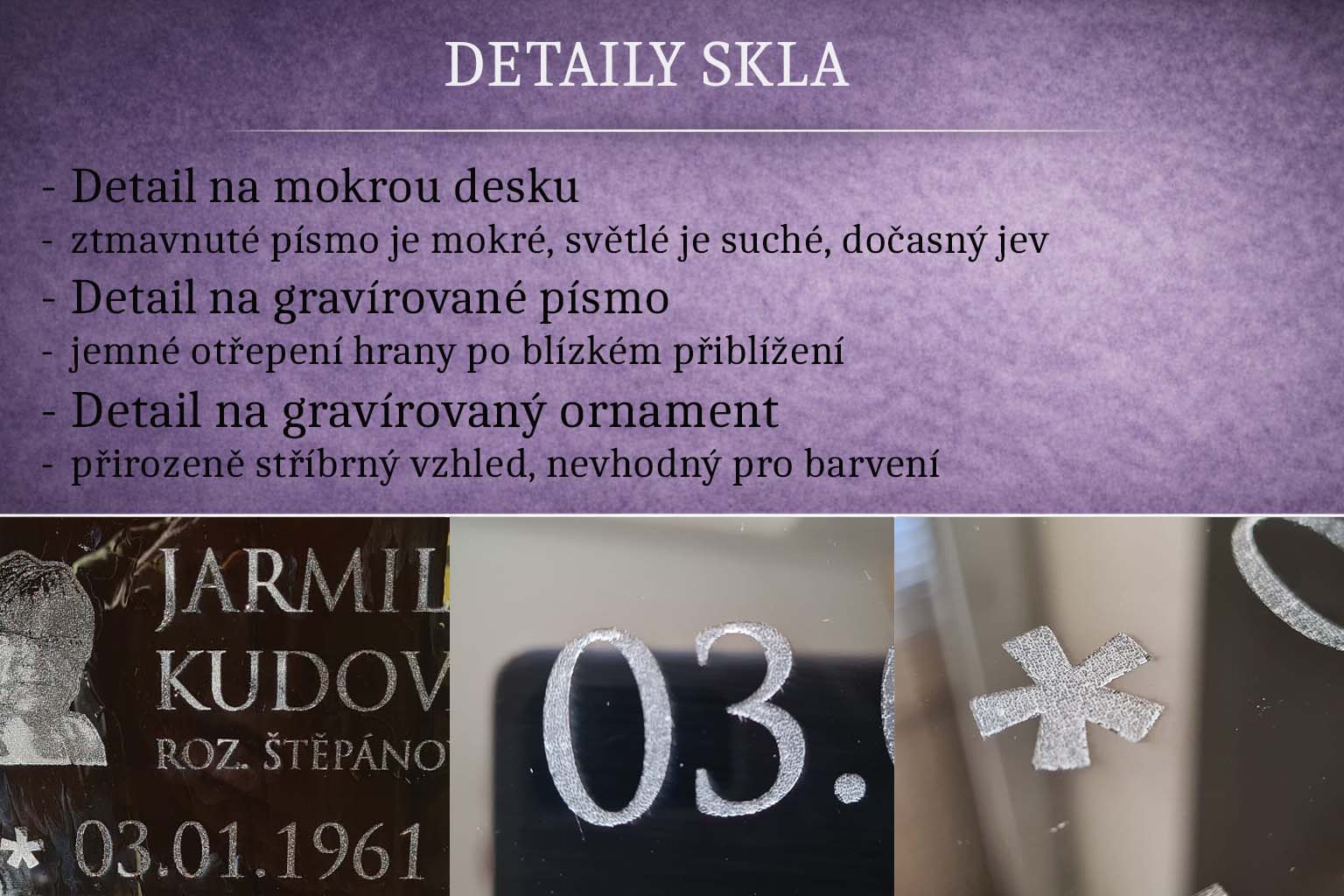 Pro výrobu skleněných desek používáme černé kouřové sklo se zabroušenými hranami. Sklo je proti světlu částečné průhledné, po nalepení či opření o podklad tato průhlednost není vidět, průhlednost může být vidět proti světlu. Upozorňujeme, že u výroby touto metodou můžou vzniknout malé nepohledové "kazy" - zpravidla mírné otřepení na krajích grafiky, které však není z pohledové vzdálenosti vidět. Při studování gravírování z blízka je možné tyto kazy vidět, nebrání to však celkovému kontextu a nesnižuje to kvalitu našeho výrobku.