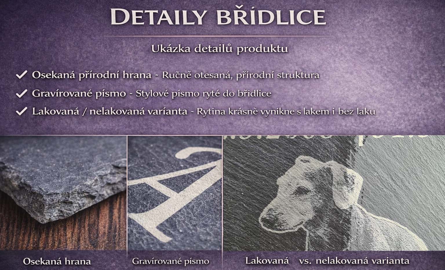 Tato přírodní hornina, nás fascinuje svou jedinečnou povahou. Je to tmavá, jemnozrnná hornina, která je ideální pro gravírování díky své pevnosti a odolnosti. Gravírování na břidlici je uměním, které využívá moderní technologie laseru k vytvoření trvalého a precizního značení na povrchu břidlice. Při gravírování paprsek laseru odstraňuje část povrchu břidlice( tepelná reakce ), což vytváří světlé trvalé značení s jasnými detaily a kontrastem, kdy je gravírování do bílo šedé barvy. Vytváří se tak kontrast k černému pozadí. Gravírování je povrchové, není do hloubky ani nevystupuje. Výsledek je hladká deska včetně značení. Břidlici navíc nabízíme v několika velikostech a rozměrech.