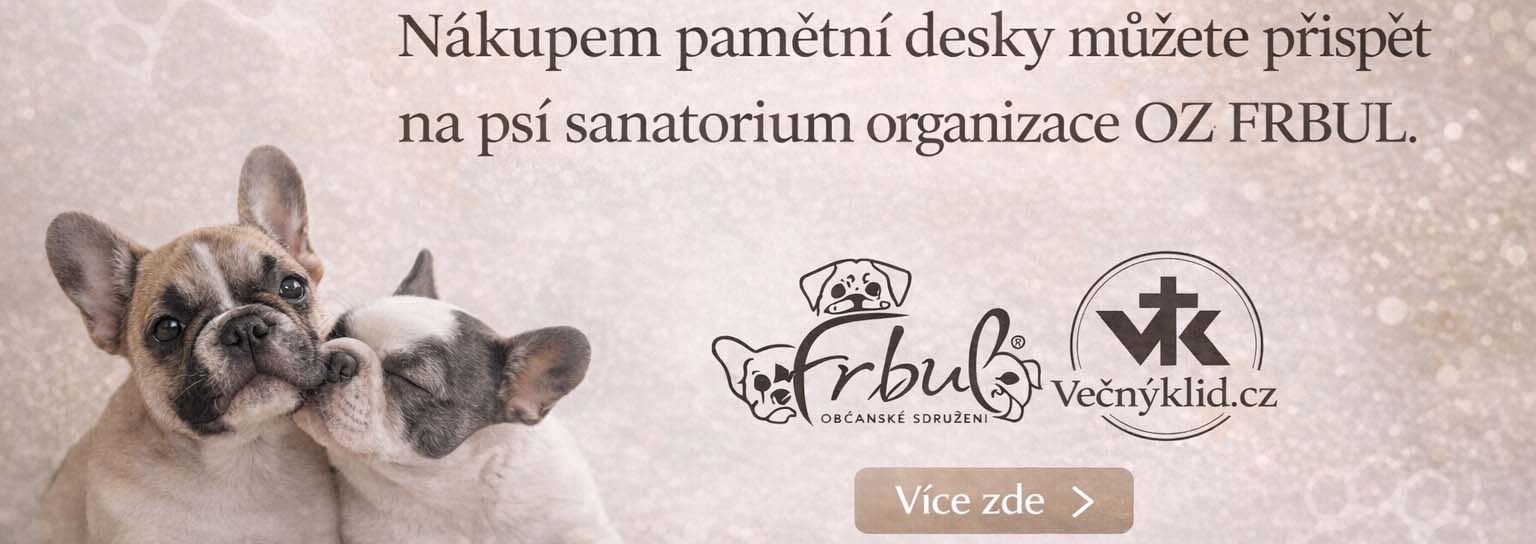 Při objednávce pamětní desky pro Vašeho zvířecího přítele můžete do košíku přidat položku Příspěvek OZ FRBUL - tím přispějete této organizaci 50 kč. My zpracujeme Vaši objednávku a uhrazený příspěvek přepošleme organizaci Frbul. Aby toho nebylo málo, my jako firma Večnýklid.cz k této Vaší pomoci přidáme dalších 25 Kč. Celkem tak přispějete organizaci 75 kč, což zaplatí například jídlo pro psa na dva dny.