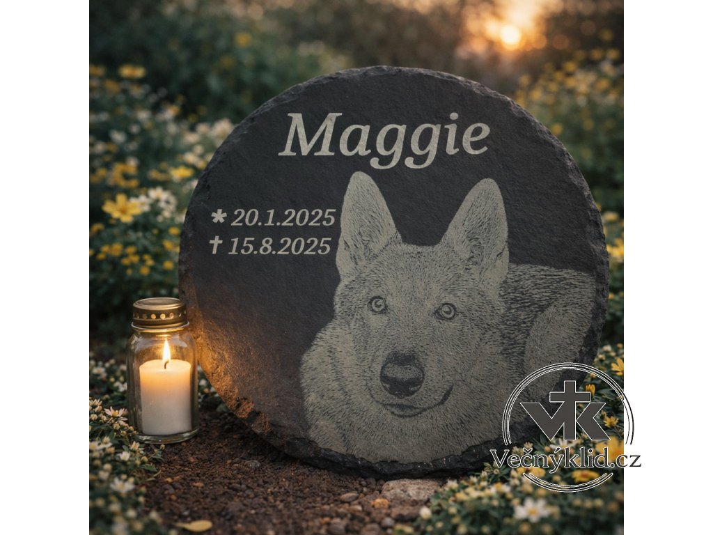 Náhrobek pro psa z přírodního, ekologického štípaného kamene - břidlice. Je to tmavá, jemnozrnná hornina, která je ideální pro gravírování díky své pevnosti a odolnosti. Gravírování na břidlici je uměním, které využívá moderní technologie laseru k vytvoření trvalého a precizního značení na povrchu břidlice. Při gravírování paprsek laseru odstraňuje část povrchu břidlice, což vytváří trvalé značení s jasnými detaily a kontrastem, kdy je gravírování do bílo šedé barvy. Vytváří se tak kontrast k černému pozadí. Gravírování je povrchové, není do hloubky ani nevystupuje. Výsledek je hladká deska včetně značení. Deska i gravírování jsou odolné vůči počasí a UV záření.