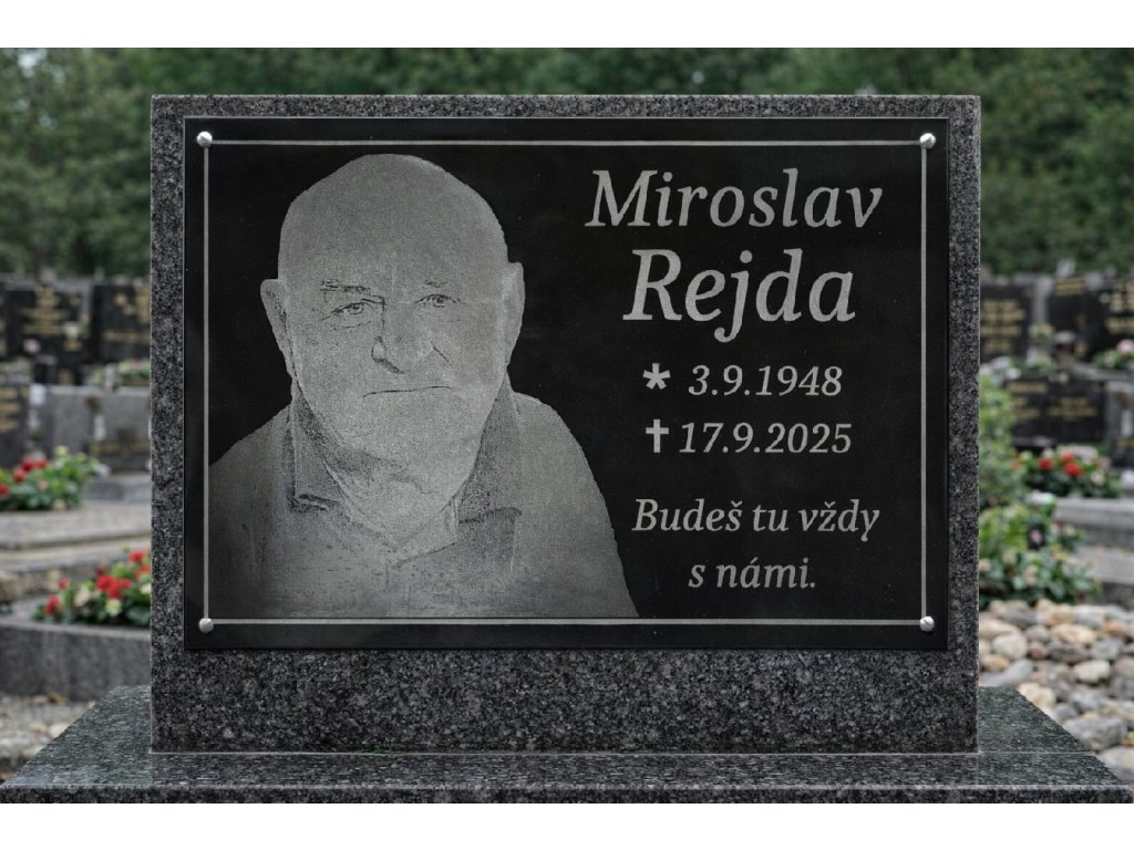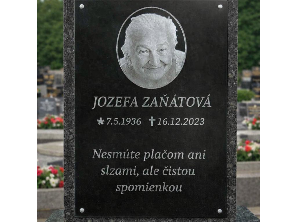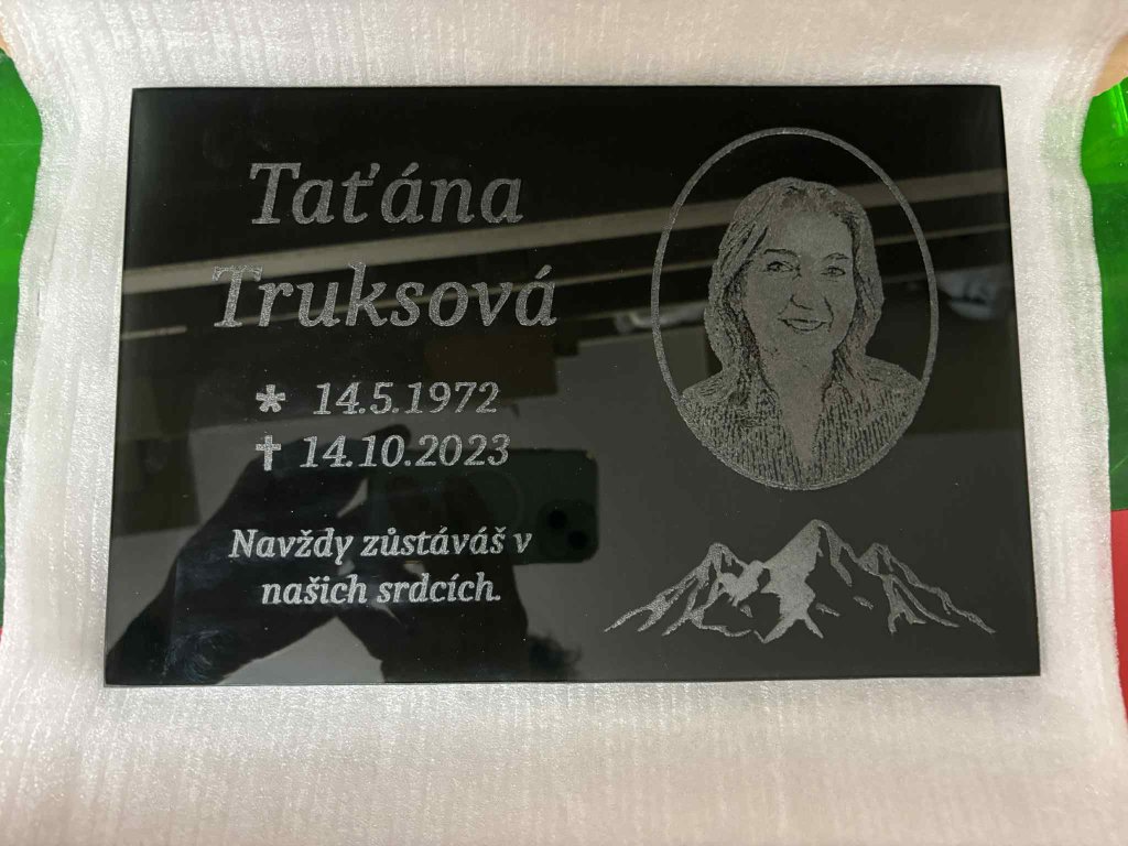 Náhrobní pamětní deska z černého skla s textem a fotkou o rozměru 50x30cm představuje zažité značení posledního místa odpočinku Vašich milovaných.