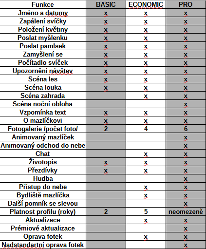 Stránka obsahuje úvodní text se jménem a datumy, dále úvodní fotografii, krátké a dlouhé citace dle výběru, krátký životopis, galerii až 6ti fotek, jednoduchý chat, kde můžete poslat svému milovanému vzkaz do zvířecího nebe, část s přezdívkami a především interaktivní tlačítka, kterými se lišíme od konkurence.